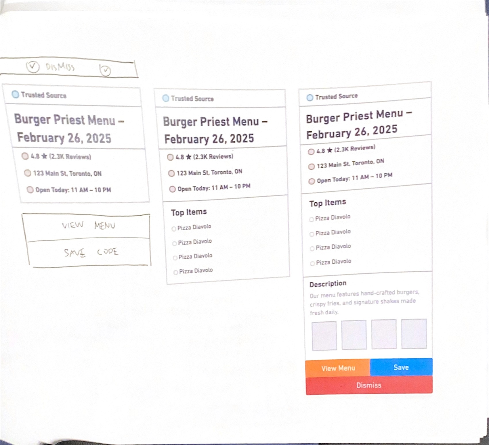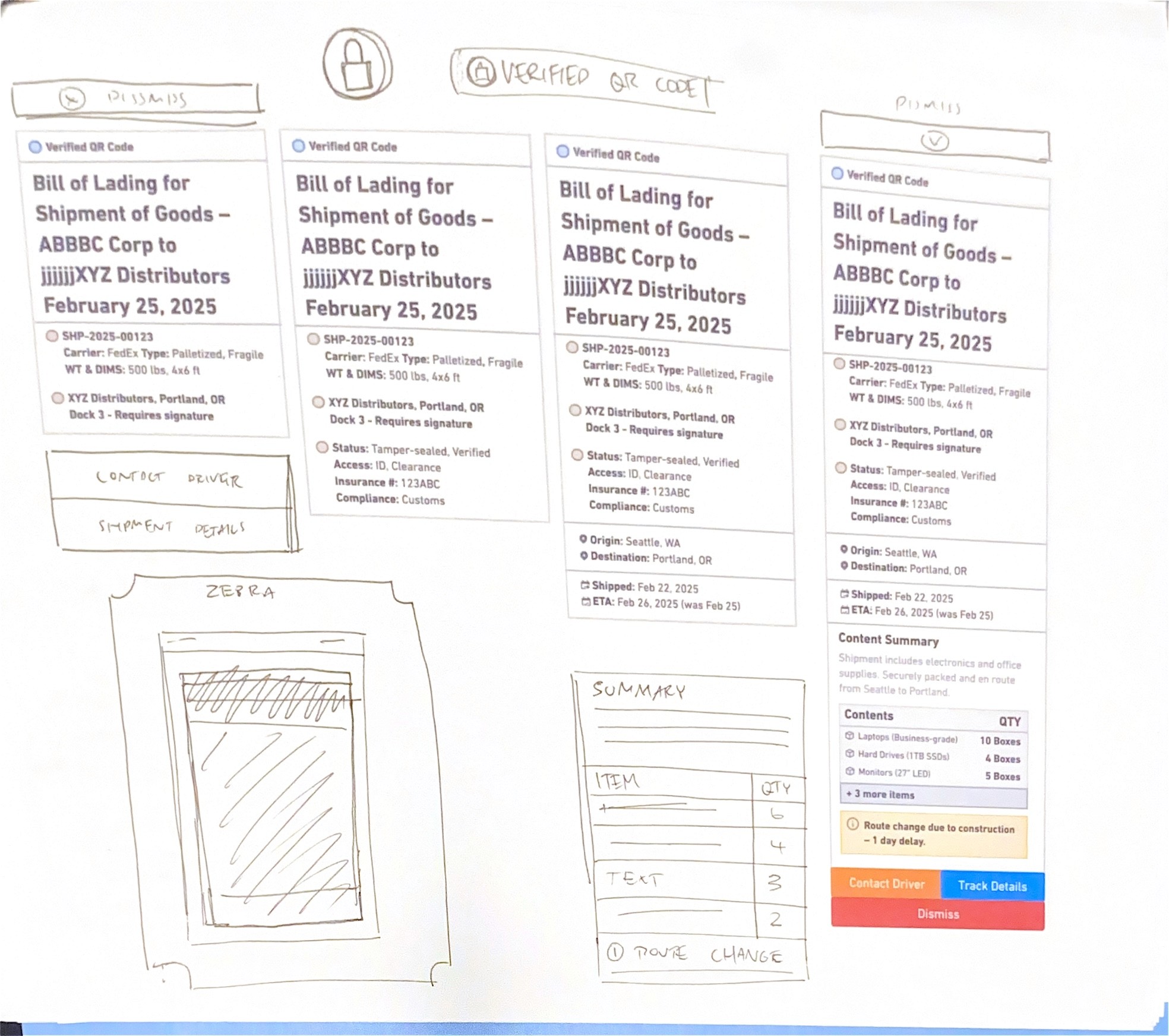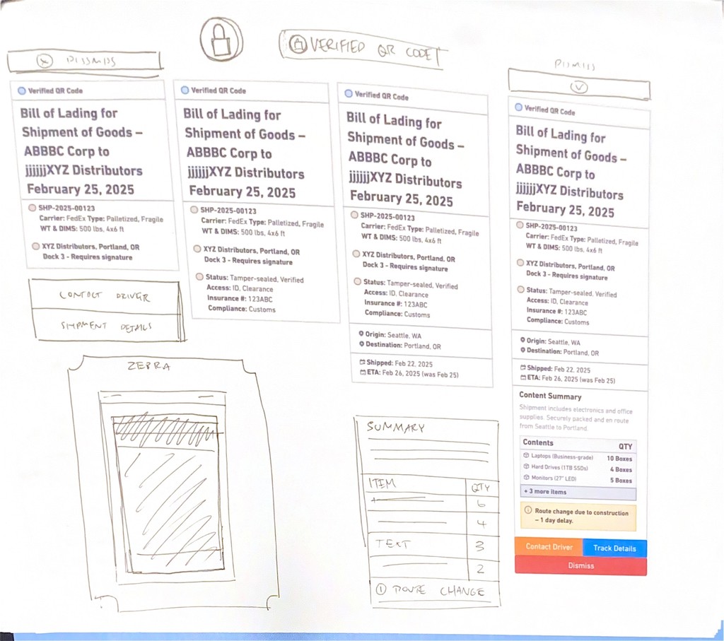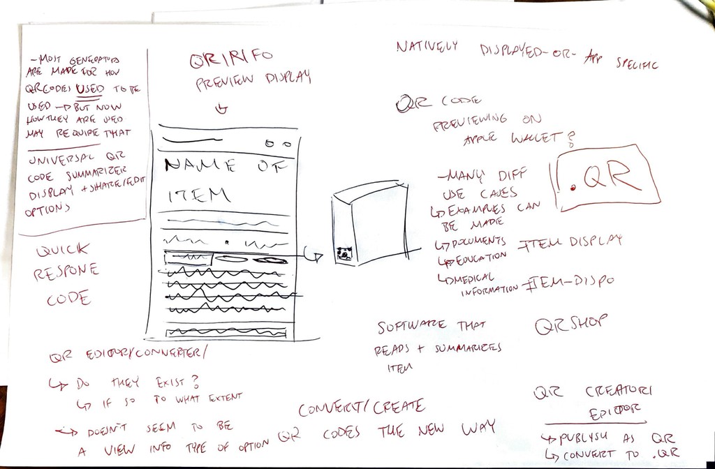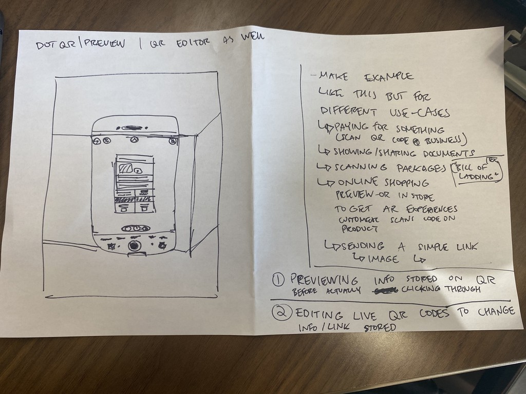 Initial sketches examined how preview overlays can display important information before users decide to open a link. Recognizing diverse user needs, early iterations experimented with generic layouts that treated all QR codes equally. However, this approach quickly highlighted its limitations: for instance, a delivery driver scanning 250 packages requires different information compared to someone checking a restaurant menu.