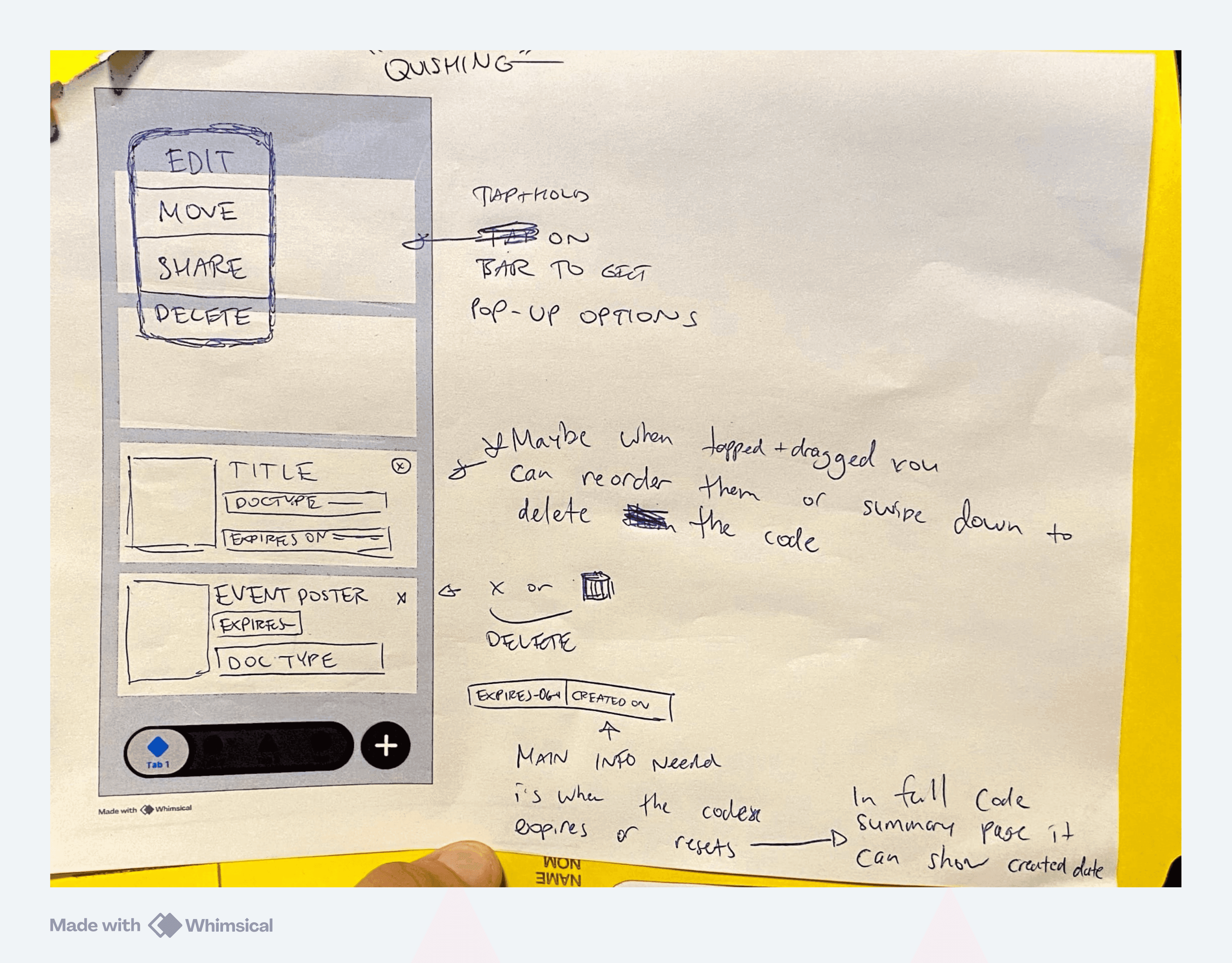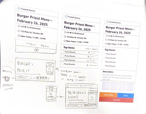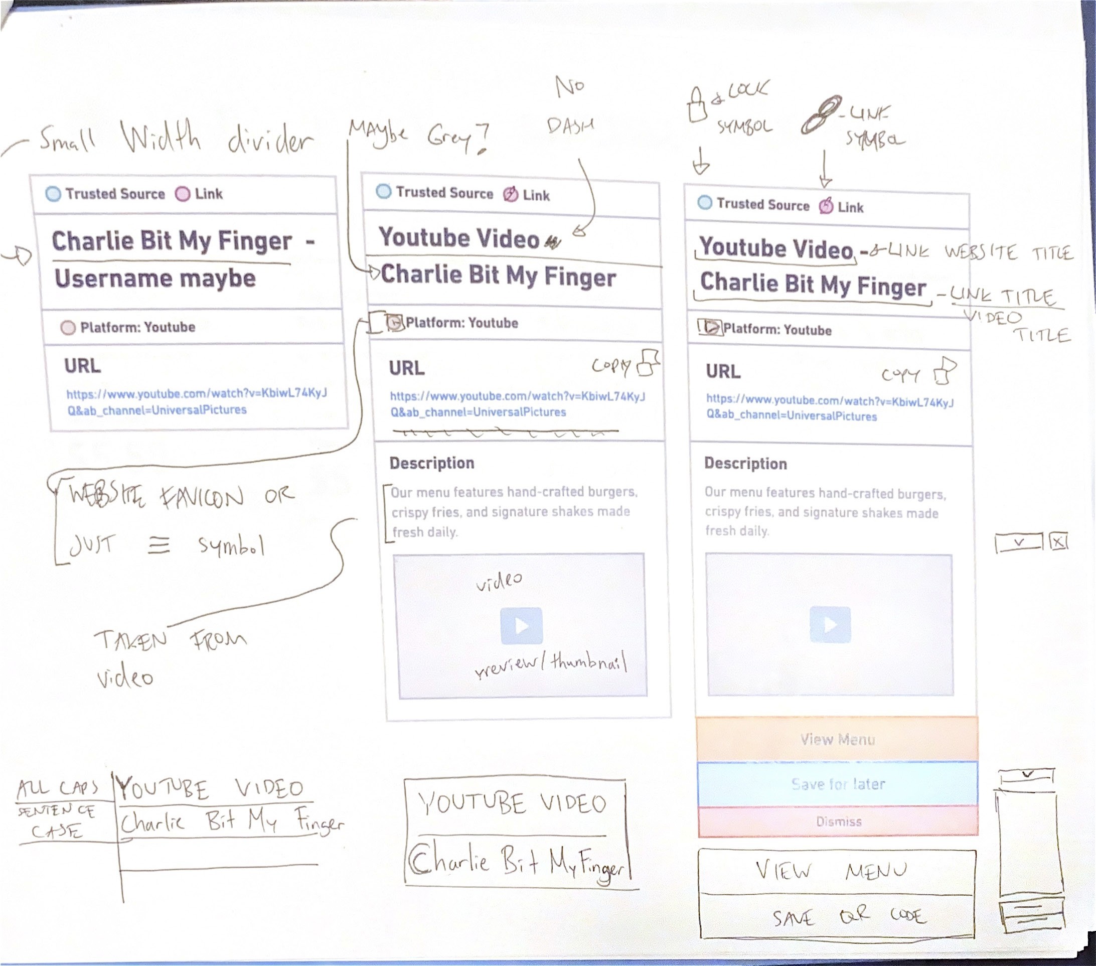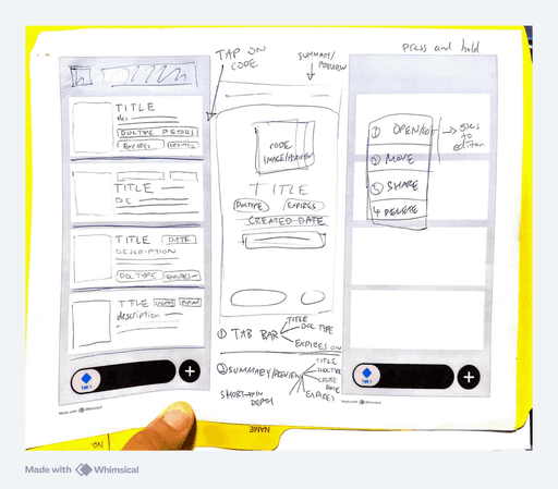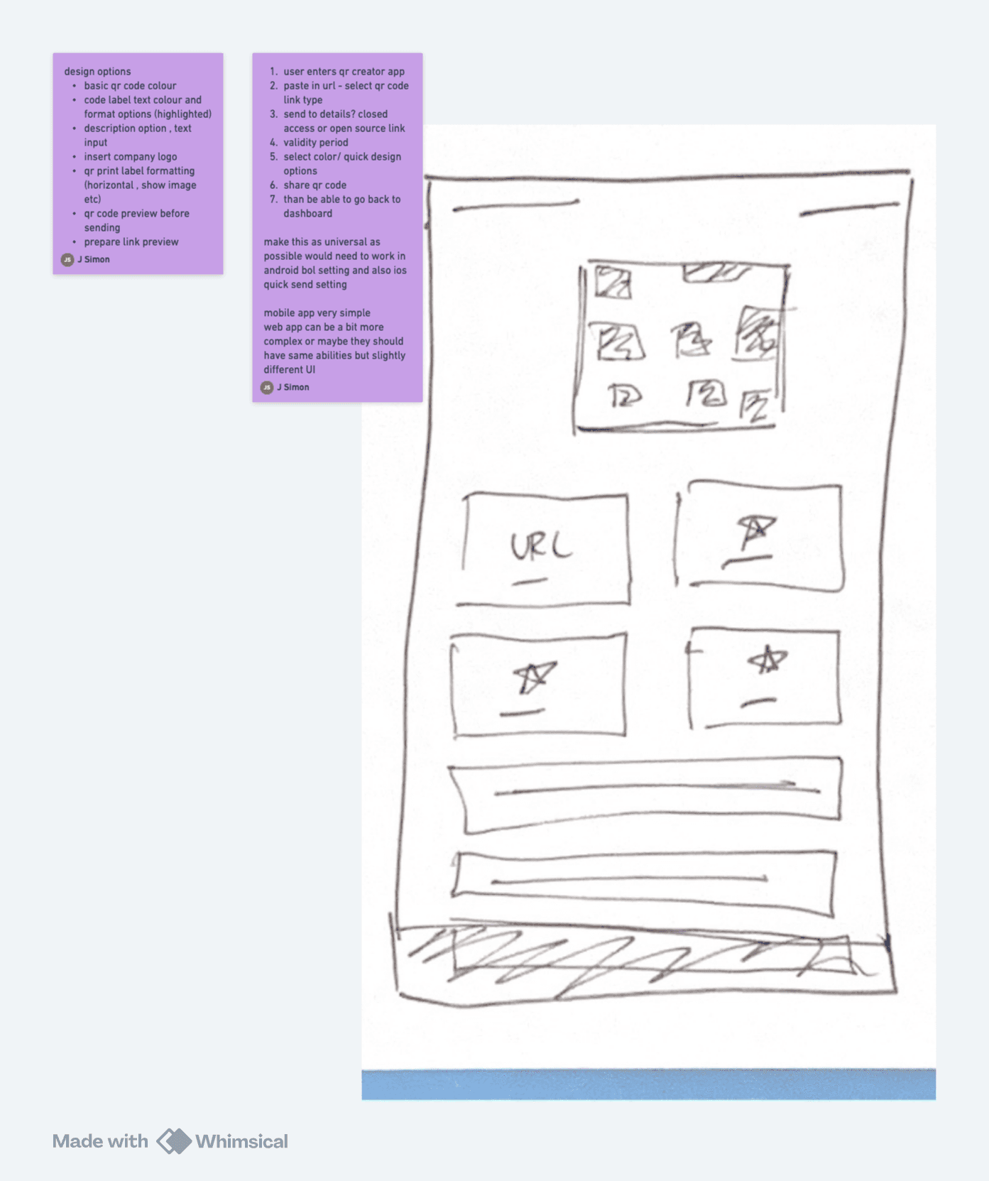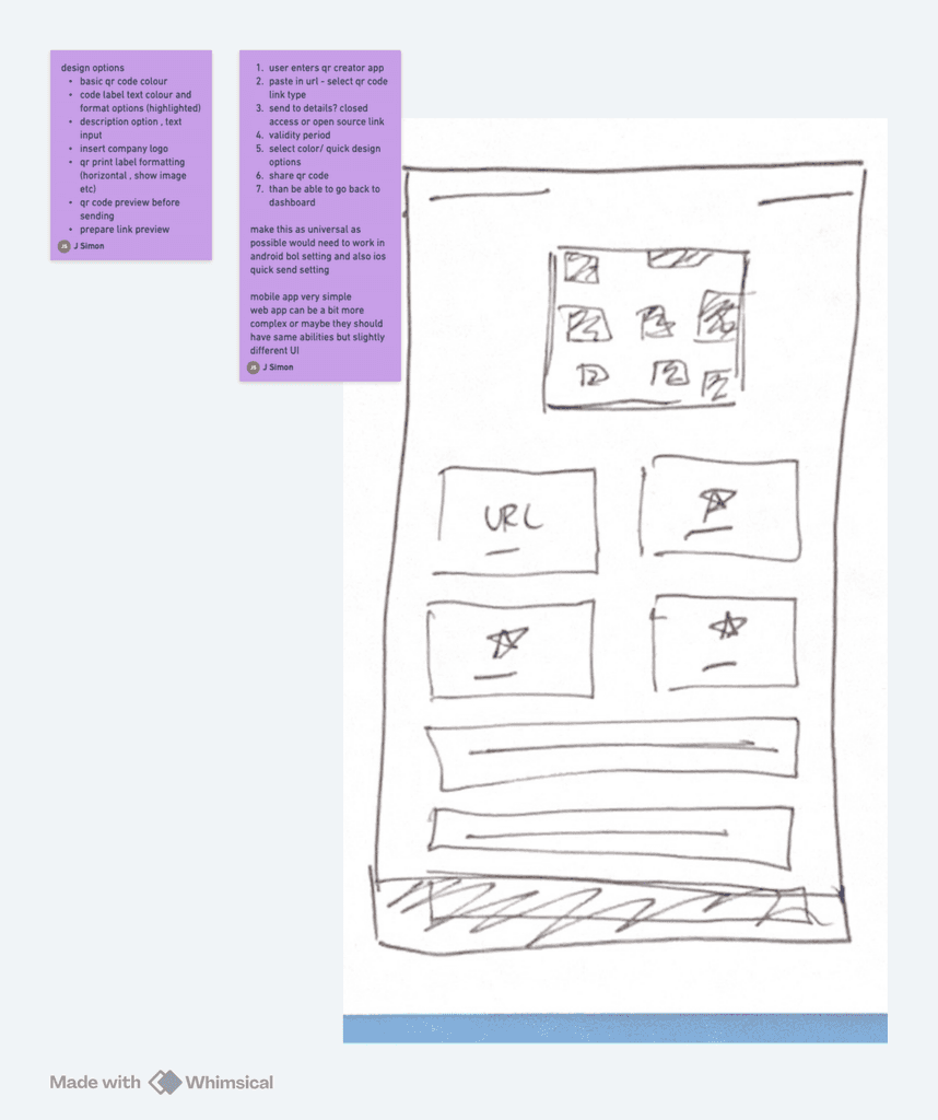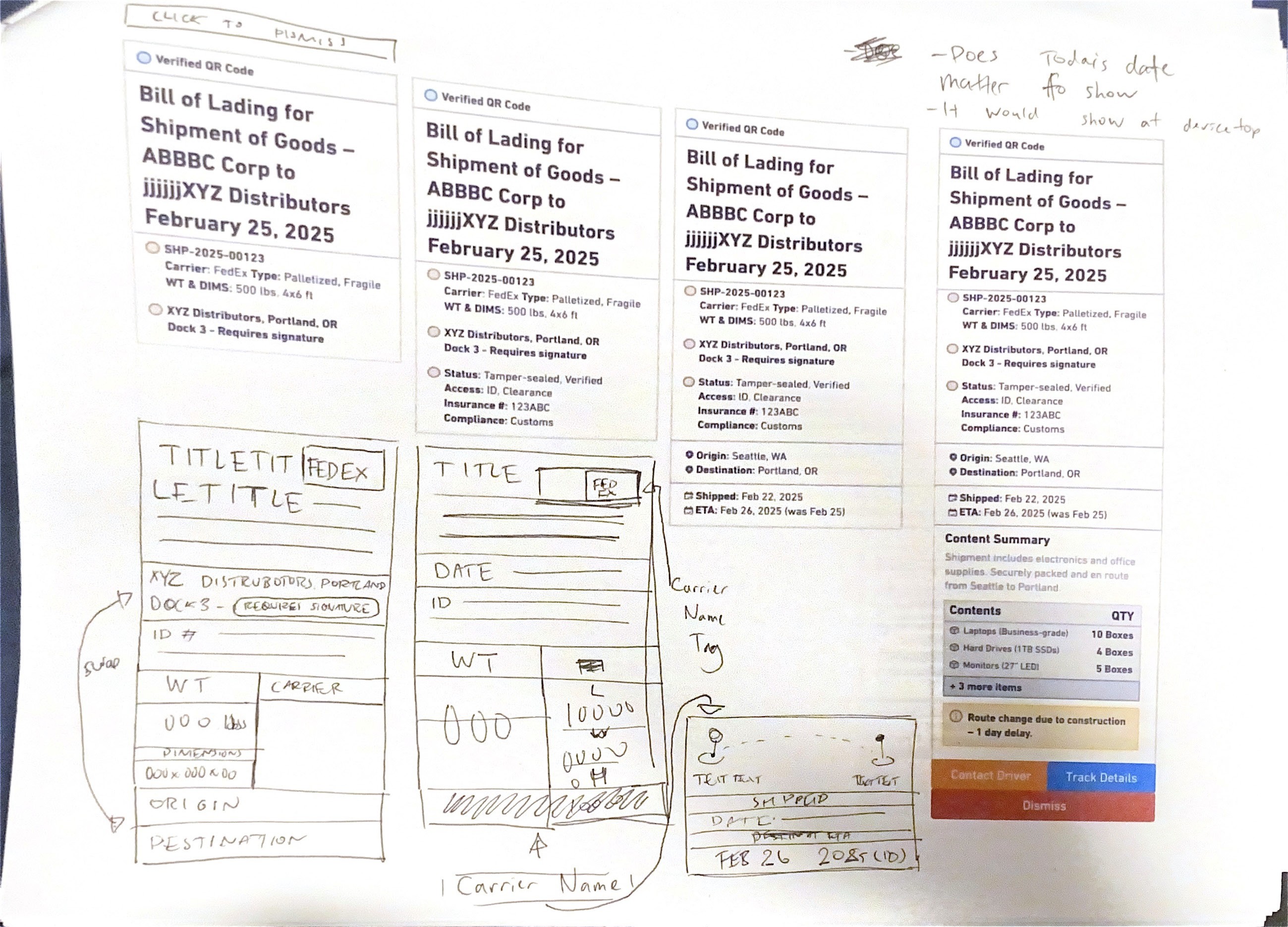 Initial sketches examined how preview overlays can display important information before users decide to open a link. Recognizing diverse user needs, early iterations experimented with generic layouts that treated all QR codes equally. However, this approach quickly highlighted its limitations: for instance, a delivery driver scanning 250 packages requires different information compared to someone checking a restaurant menu.