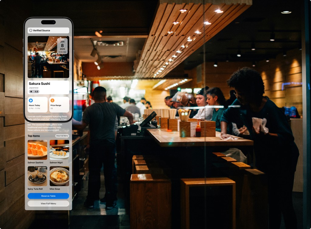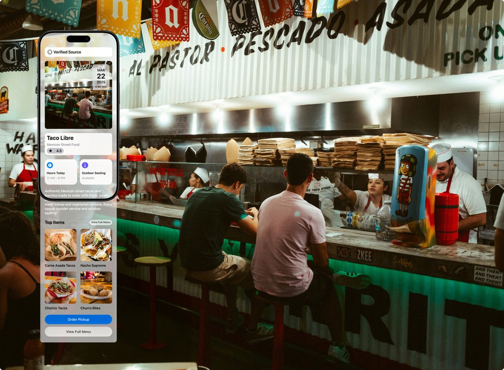 A diner scans a QR code at a restaurant. The preview displays the restaurant’s name, cuisine type, and hours, then loads the full menu. This feature helps eliminate confusion in areas where multiple establishments operate close together.