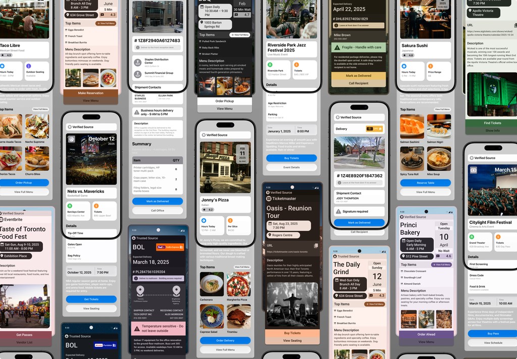 Instead of forcing all use cases into a single preview format, I created flexible containers that adapt according to the content type. Restaurant previews display the venue name, menu type (PDF or webpage), and verification status. Shipping previews emphasize tracking numbers, delivery addresses, and any special handling instructions. Event previews present the date, venue, verified ticket source, and price range.