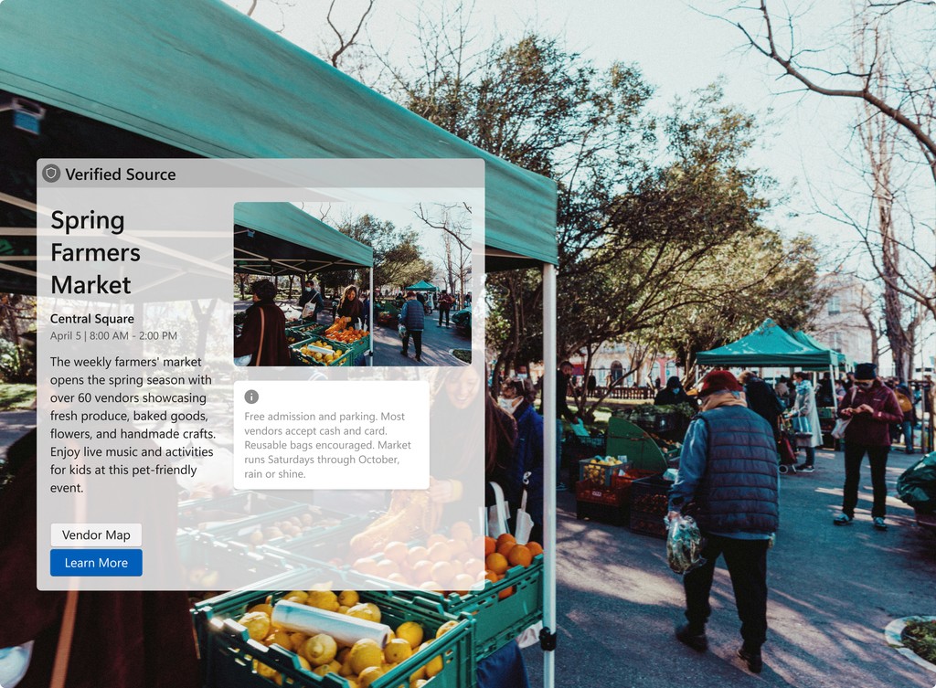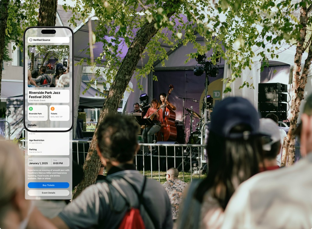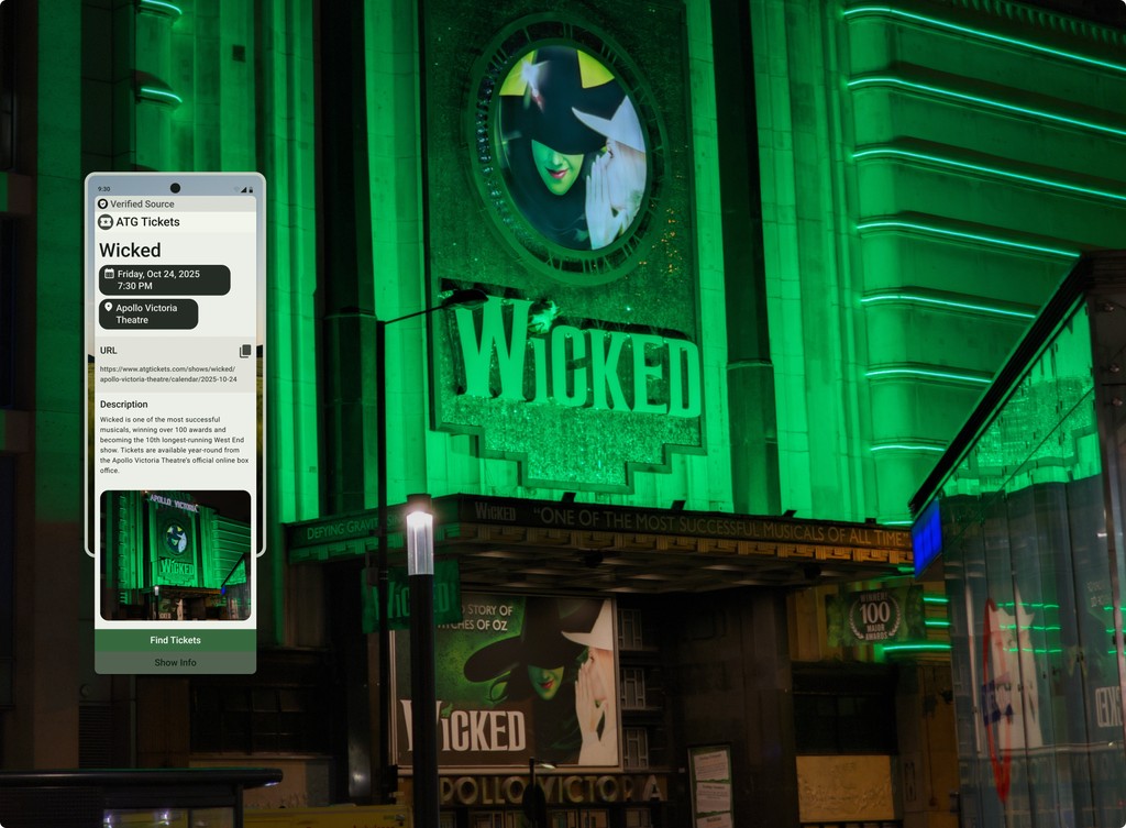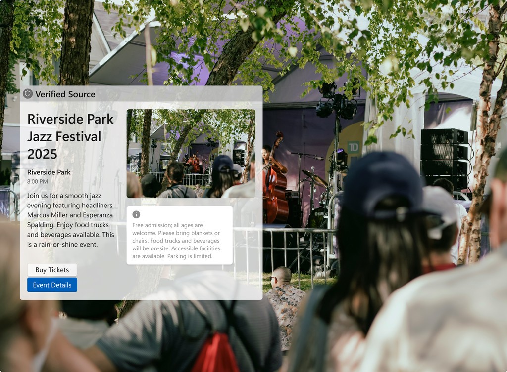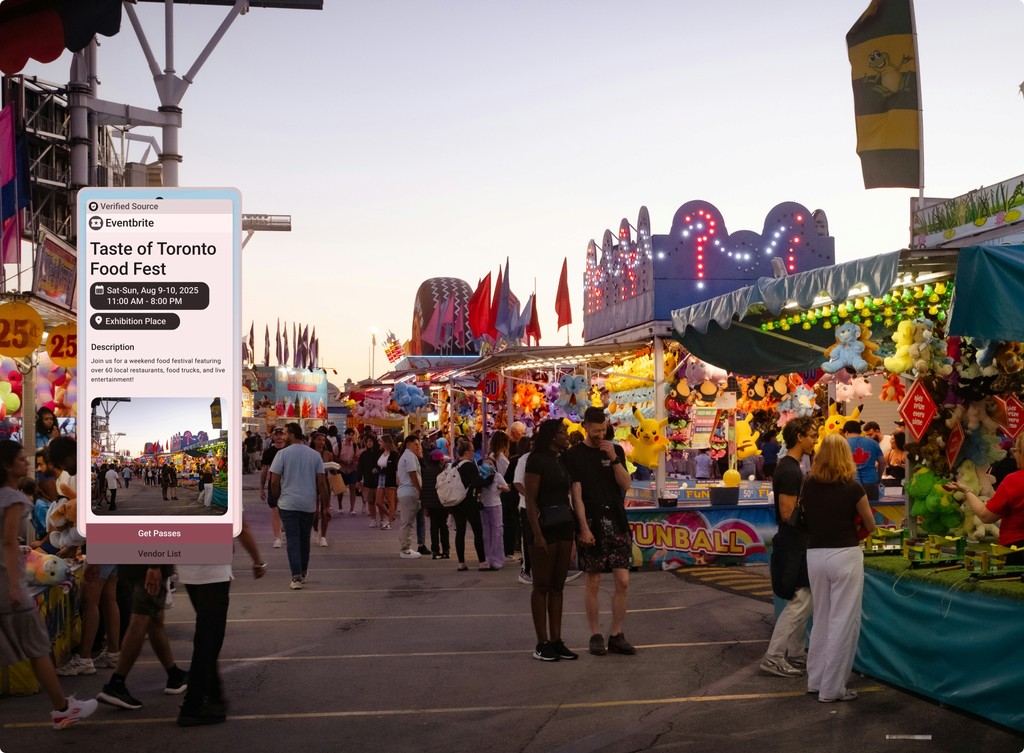 A concert-goer scans a poster downtown. The preview immediately shows the event name, date, venue, and ticket price range, allowing them to decide whether to proceed to ticketing without leaving their current app.